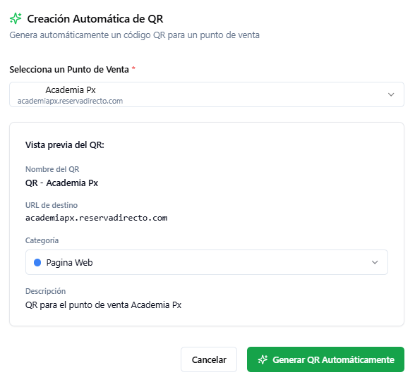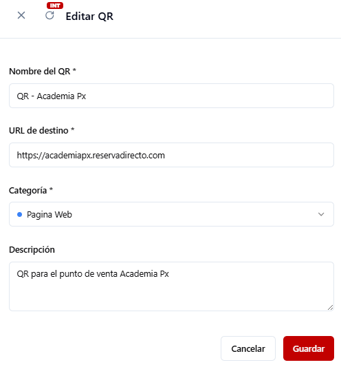 - El sistema genera automáticamente el nombre del QR, la URL de destino y una descripción, que puedes modificar.