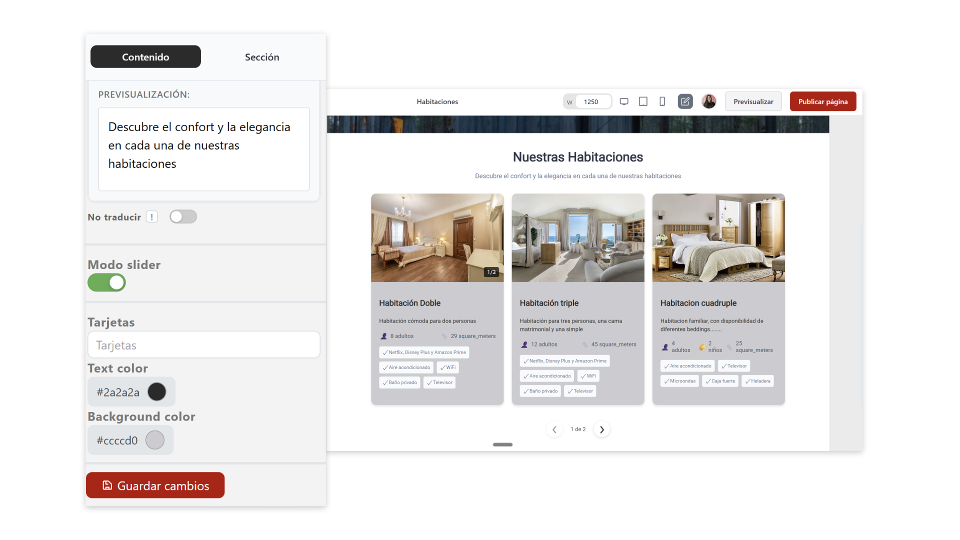 Aquí defines el comportamiento y los textos:- Título principal (ej. “Nuestras Habitaciones”)